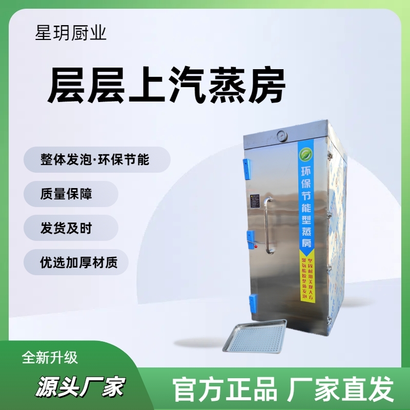 蒸箱内蒸汽扩散快,热效率高,蒸制食品受热均匀,.米饭蒸箱受热薄盘设计,快捷,不仅蒸制米饭速度快,而且米饭底盘不粘,分粒清晰,香味浓郁.本设备是一种以蒸汽为能源,利用蒸汽烹饪加工食物的一种箱式设备。